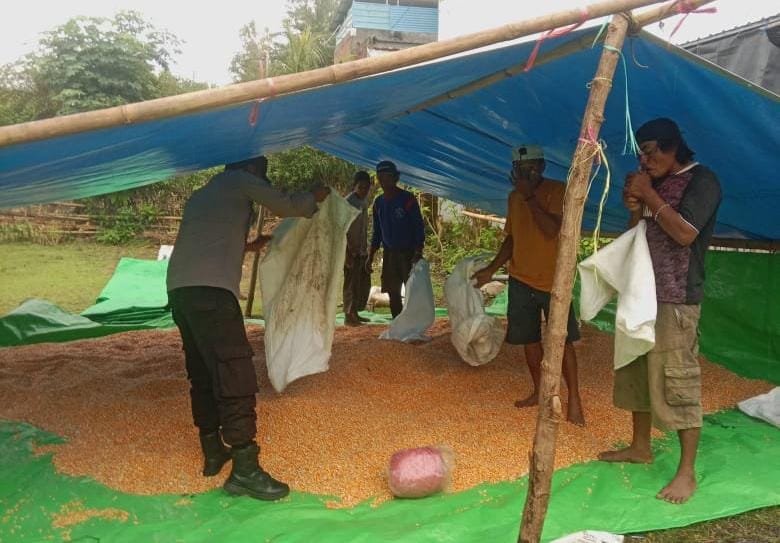 Bhabinkamtibmas Polsek Soromandi Polres Bima Polda NTB membantu menjemur jagung warga binaan di Desa Sampungu Kecamatan Soromandi Kabupaten Bima.
