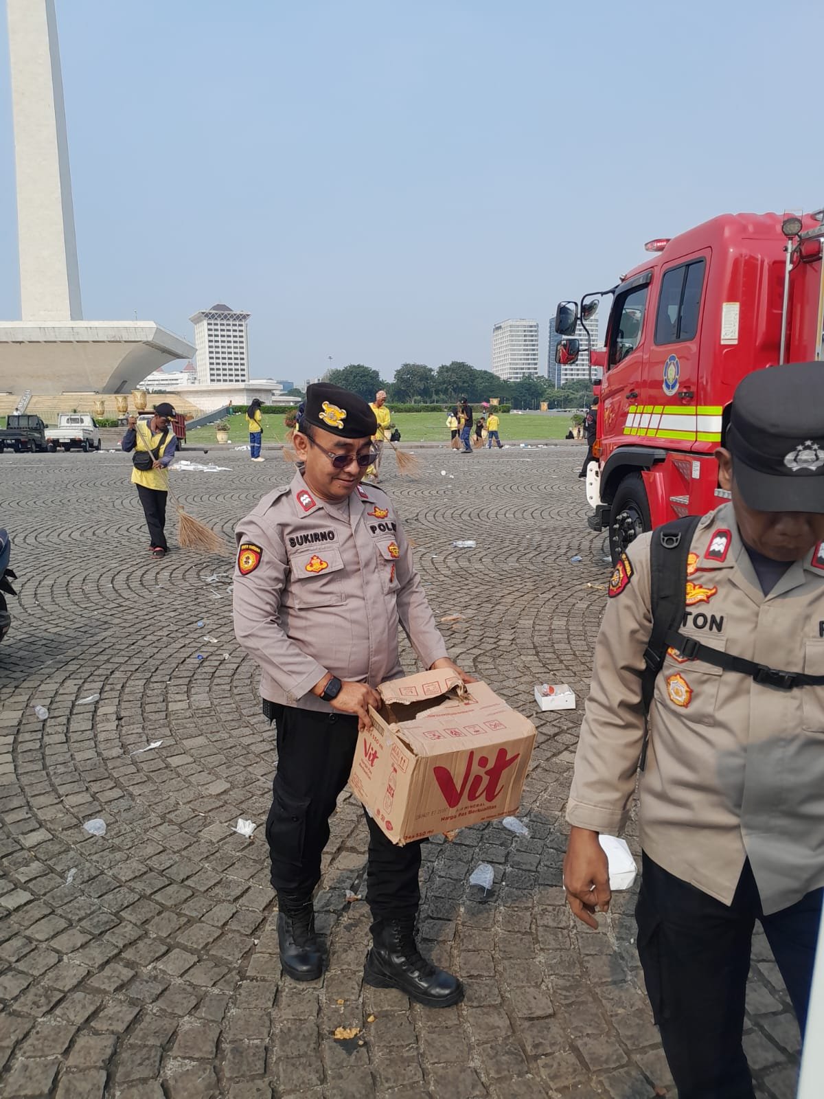 Personel Polri Sigap Bersih-bersih Kawasan Monas Usai May Day Fiesta