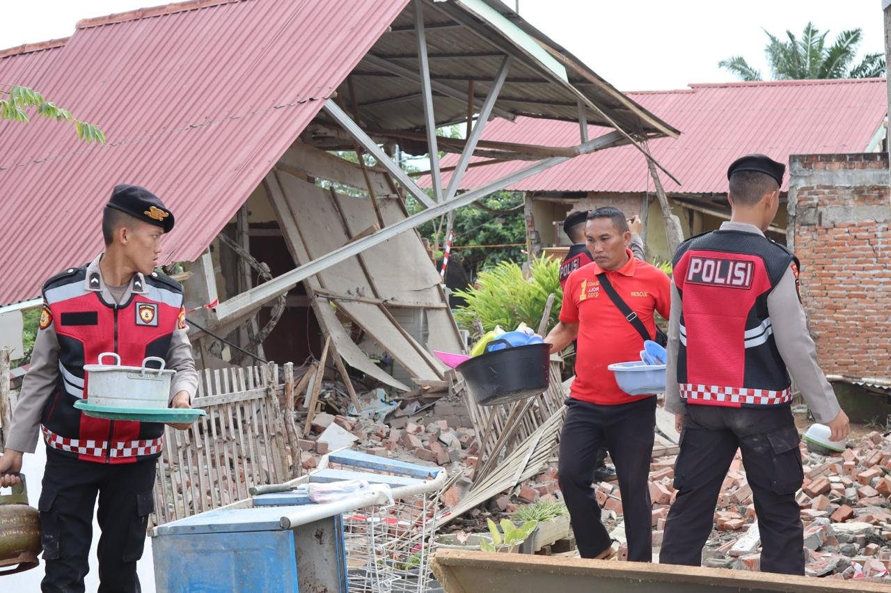 Menanggapi kondisi itu, Polri melalui Dit Samapta Polda Bengkulu bergerak cepat memberikan bantuan kemanusiaan dengan mengerahkan personel untuk membantu proses pembersihan material bangunan yang runtuh.