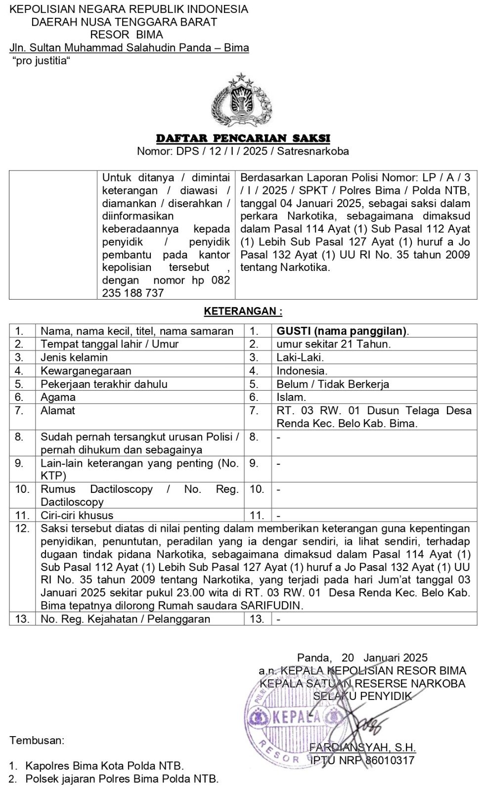 Dalam DPS, Sdr. Gusti ( nama panggilan) , selaku Saksi Kunci dalam tindak pidana narkotika di Desa Renda Kec. Belo Kab. Bima.